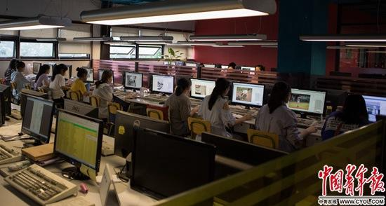 38岁的杜荣霞负责管理清一色还在实习的年轻面孔。他们在经过1到3个月的培训后,基本可以掌握处理数据的规则。有的实习生会在电脑键盘上插一个小圆镜,通过反射看到从身后经过的人,这是在学校用来观察老师行踪的办法。杜荣霞说:“他们比我的女儿大不了多少,有时候觉得就像带着一群孩子一样。”