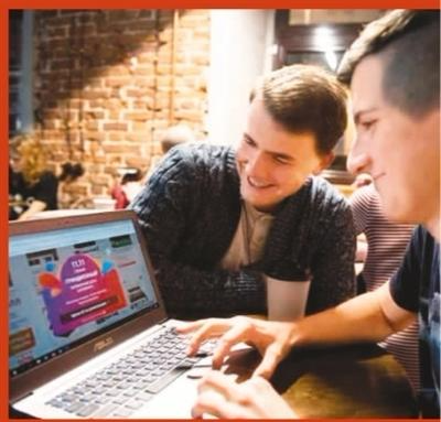 2016年11月7日,俄罗斯莫斯科大学学生奥列格(左)和亚历山大查看“双11”促销活动页面。(资料图片)