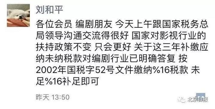中国电视剧编剧委员会会长、著名编剧刘和平发布了一条朋友圈透露,部分编剧委员会会员和国家税务总局领导进行了沟通,“国家对影视行业扶持政策不会变,只会更好。关于三年补缴应纳未纳税款对编剧行业已明确回复:按2002年国税字52号文件缴纳16%税款,未足16%补足即可。”