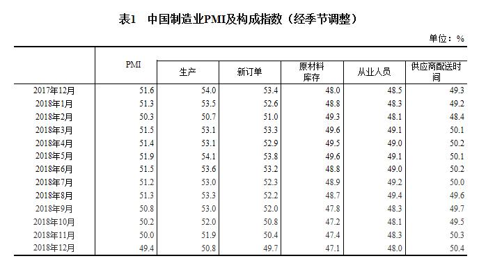 2018年12月份,中国制造业采购经理指数(PMI)为49.4%,比上月回落0.6个百分点,低于临界点,制造业景气度有所减弱。