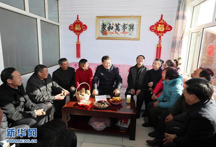2017年1月24日,中共中央总书记、国家主席、中央军委主席习近平来到河北省张家口市,看望慰问基层干部群众,考察脱贫攻坚工作。这是习近平在张北县小二台镇德胜村徐海成家同村干部和村民代表座谈。新华社记者 兰红光 摄
