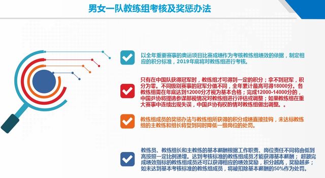 根据该考核办法,如男女队任何一个教练组考核不及格,作为中国乒协备战东京奥运会战略体系总指挥的乒协主席刘国梁将自罚全年薪酬,誓与团队共进退。