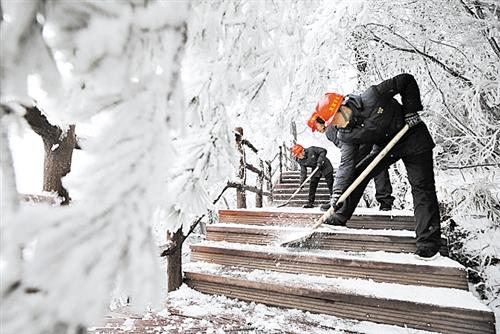 受低温雨雪天气影响,湖南张家界部分高海拔地区出现持续冰冻现象。图为工作人员清除冰雪,保障安全。 (新华社发)