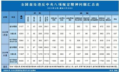 3月25日,中央纪委国家监委公布了2019年2月份全国查处违反中央八项规定精神问题汇总情况。数据显示,当月共查处问题3107起,处理4304人,给予党纪政务处分3064人。这已是连续第66个月公布月报数据。