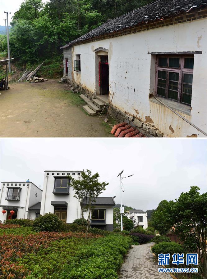 拼版照片:上图为安徽省金寨县花石乡大湾村村民的住房(2016年4月25日摄);下图为大湾村易地扶贫安置点的村民住房(2019年5月18日摄)。新华社记者 刘军喜 摄