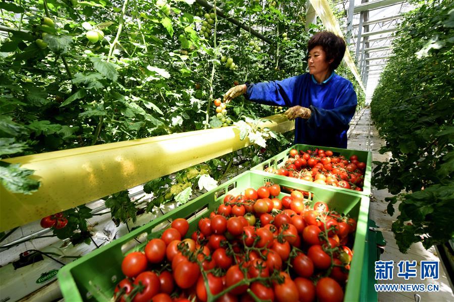 5月25日,工人在河北省南和县贾宋镇一家现代农业园区采摘西红柿。新华社记者 朱旭东 摄