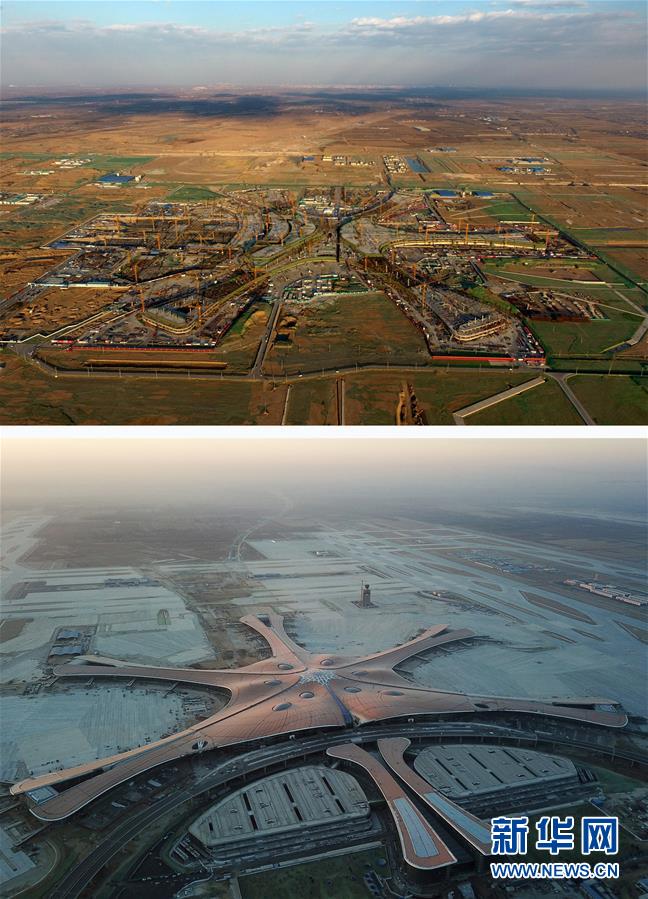 拼版照片:上图为2017年2月25日拍摄的北京新机场建设工地(新华社记者罗晓光摄);下图为2018年12月29日拍摄的主航站楼外立面装修工程全面完成的北京大兴国际机场(新华社记者鞠焕宗摄)。新华社发