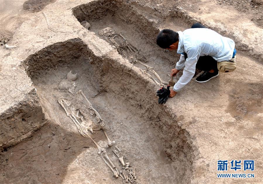 工作人员在河南省安阳市洹北商城商代铸铜工匠家族墓地进行清理发掘(6月5日摄)。新华社记者李安摄