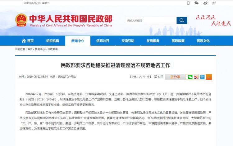 2018年12月,民政部、公安部、自然资源部、住房城乡建设部、交通运输部、国家市场监管总局联合印发《关于进一步清理整治不规范地名的通知》(民发﹝2018﹞146号),对清理整治不规范地名工作作出安排部署。当前,各地正按照六部门部署,积极推进清理整治不规范地名工作,但个别地方也存在政策标准把握不够准确、组织实施不够稳妥等情况。