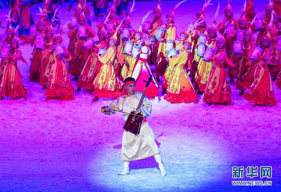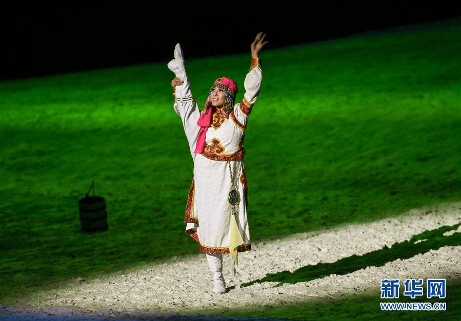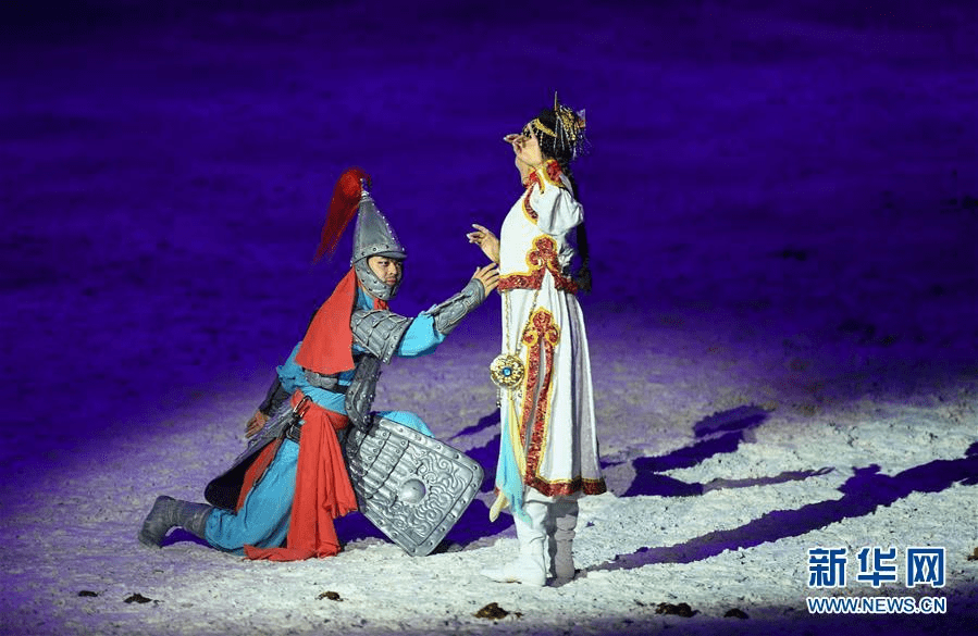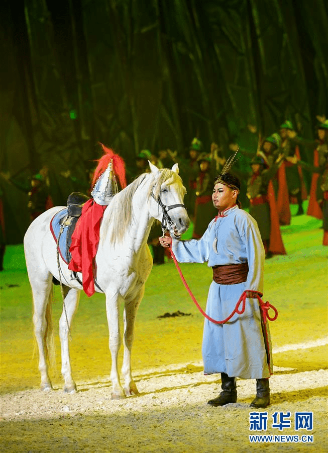 6月21日,演员在大型实景剧《蒙古马》中表演。当日,由内蒙古锡林郭勒职业学院出品的大型实景剧《蒙古马》在内蒙古锡林浩特市上演。全剧共十四个篇章,沿着“战争”和“爱情”两条线索,生动地讲述了年轻的蒙古族战士兀良哈与爱马在战争中相伴相随,以及兀良哈和女主角相识相爱、生死分离的故事。新华社记者 彭源 摄