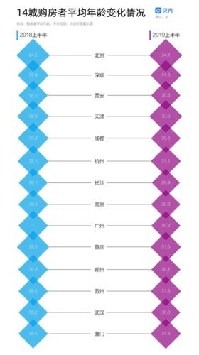 因此,在《报告》重点观测的城市中,北京、重庆、成都等9个城市的二手房购房者平均年龄越来越趋于年轻化。其中,长沙购房者最年轻,平均为28.9岁,而重庆购房者的年龄降幅最大,较2018年上半年足足提前了两年,达到31.5岁。虽然北京深圳的购房者平均年龄仍然较高,但与2018年相比,购房者平均年龄在降低。2018年上半年,北京购房者平均年龄约为34.5岁,深圳购房者平均年龄约为32岁。