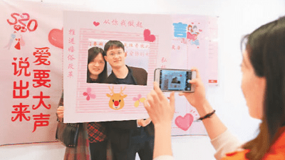 每年的5月20日都是情侣结婚登记的热门日子之一。图为2019年5月20日,在重庆市沙坪坝区民政局婚姻登记处,新人在“说出爱的誓言”环节合影留念。孙凯芳摄(人民视觉)