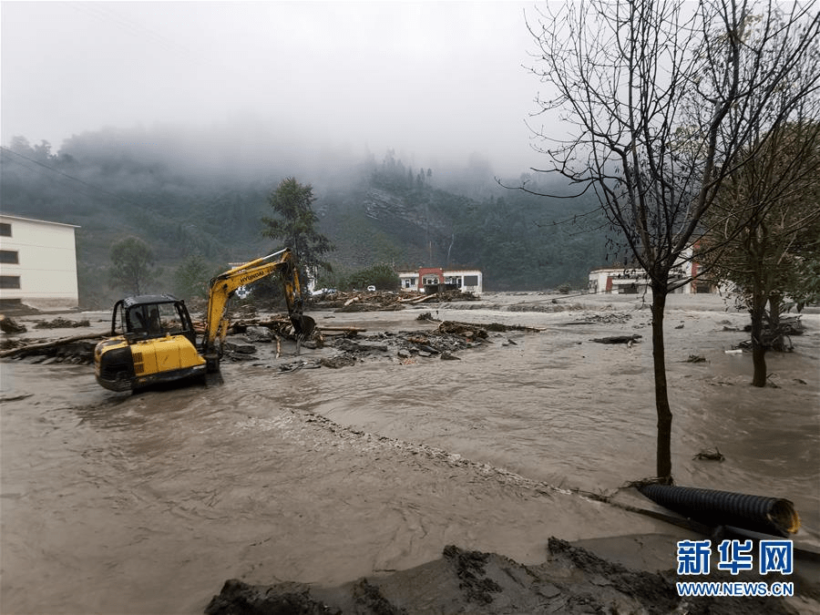 在汶川县三江镇,挖掘机试图挖通排水沟(8月20日摄)。 记者从四川省应急管理厅获悉,截至20日15时,发生在四川阿坝州的暴雨灾害已造成汶川县、理县、茂县、松潘县和卧龙特区的11个乡镇1.27万人受灾,4人死亡。 新华社发(黄建章 摄)