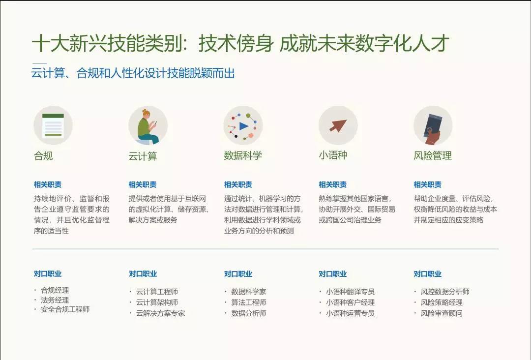 在这十大新兴技能中,除了技术技能,也有一些非技术技能脱颖而出,例如合规和风险管理。这一趋势得到了金融、医药企业界的认同。他们普遍认为,当前行业监管力度加大、市场不确定性增加,因此企业对合规和风险管理也更为重视。
