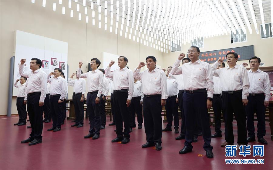 中共河北省清河县委理论学习中心组开展“不忘初心、牢记使命”主题教育集中学习。这是党员干部重温入党誓词(2019年9月17日摄)。新华社记者邢广利摄