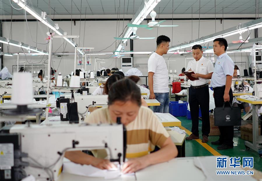 河北省巨鹿县纪委监委工作人员在巨鹿县西大韩村一家扶贫工厂向企业负责人了解扶贫项目落实情况(2019年7月12日摄)。新华社记者牟宇摄