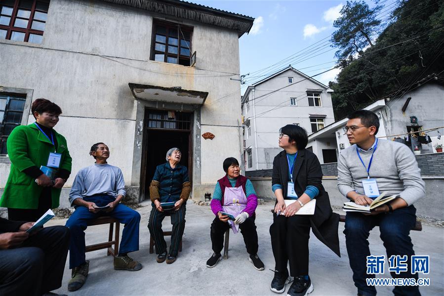 浙江省杭州市临安区龙岗镇新溪新村的村级监察联络员许芳凌(左一)与龙岗镇的纪委干部(右一、右二)在村里向百姓了解村级改造工程的规范实施情况(2019年12月16日摄)。新华社记者徐昱摄