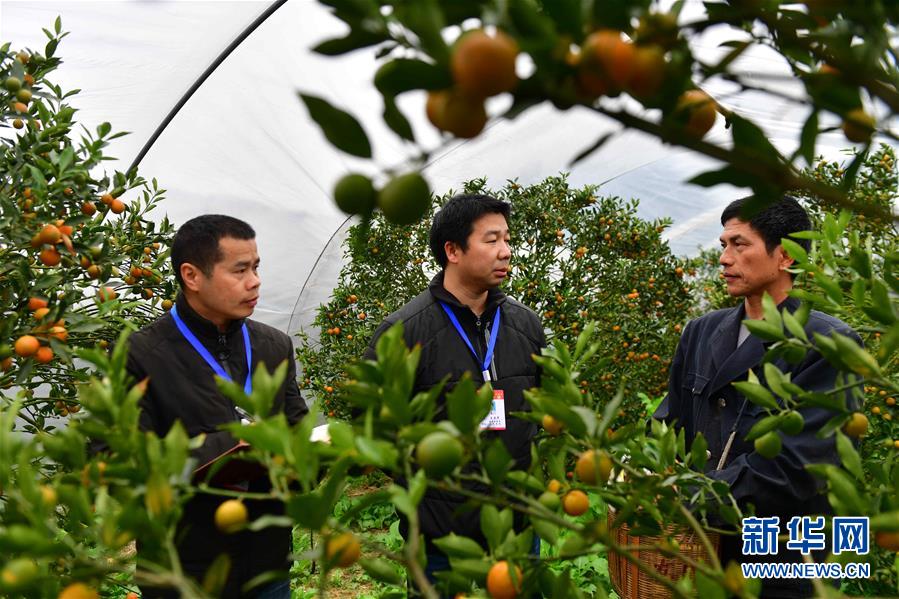 纪检监察干部(左、中)在广西柳州市融安县大将镇了解金桔产业奖补资金发放情况(2019年12月30日摄)。新华社记者黄孝邦摄