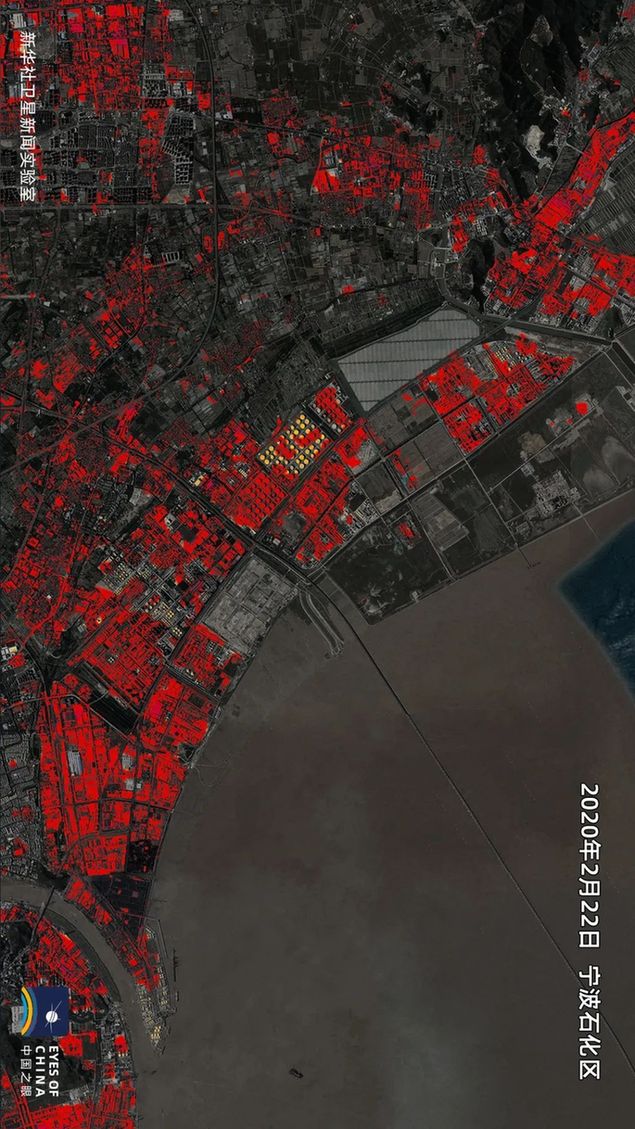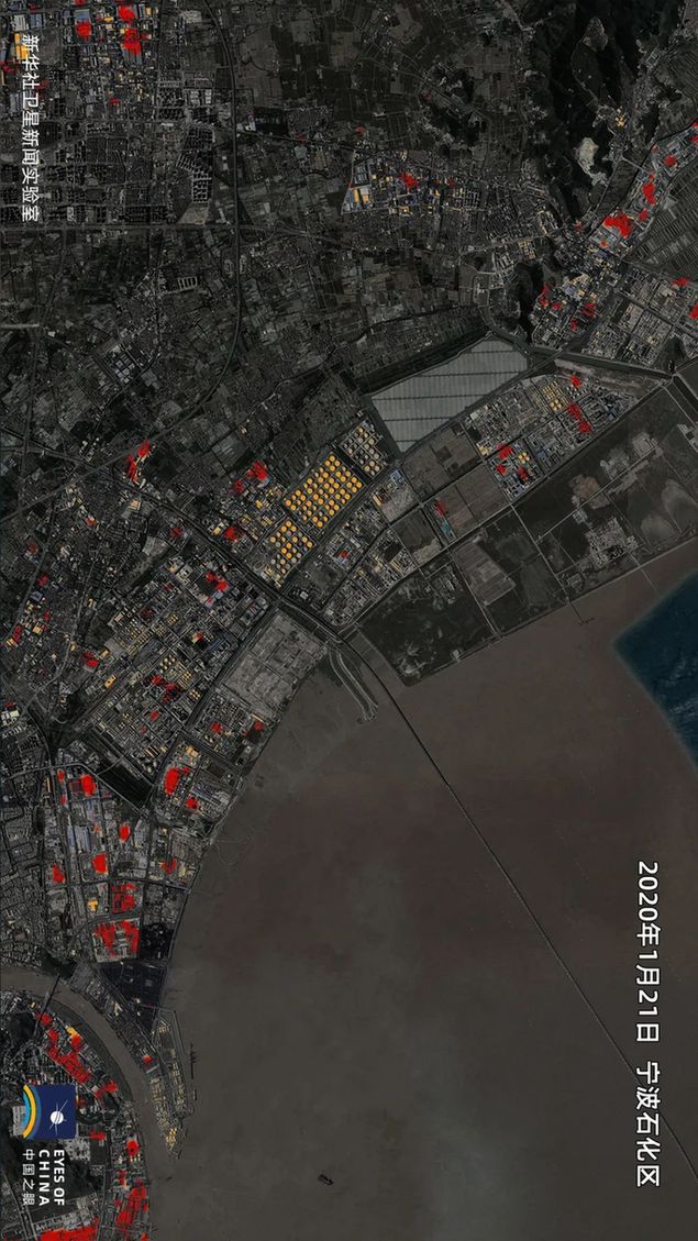 这是位于上海市西南部、杭州湾北岸的金山区,临近春节时和近日,时隔一个月的卫星图对比。红色代表该地地面温度高于整个地区平均气温,通常来自火灾、工业/能源生产和大密度的人口生活、生产。