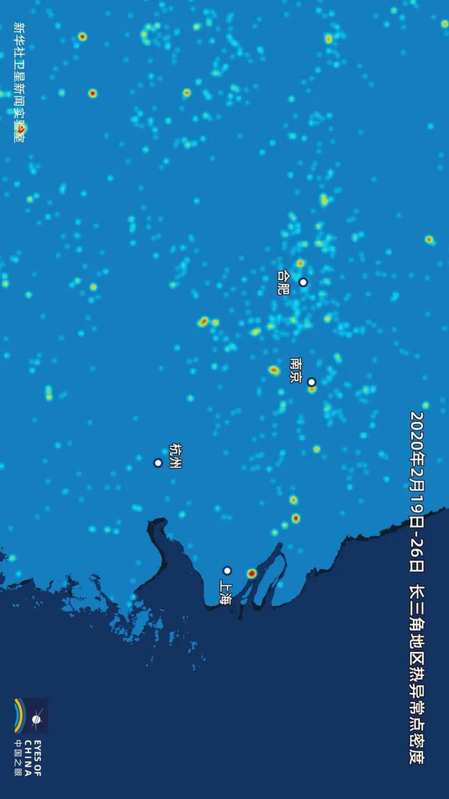 观察一月下旬与二月下旬的卫星数据,与春节期间相比,2月19日起的一周内,长三角区域内的热异常密度增长了数十倍。