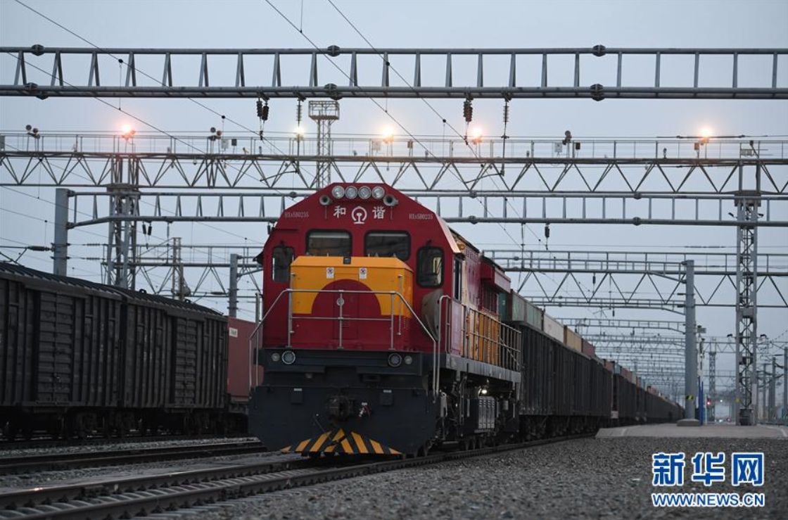 4月12日,一列中欧班列驶出阿拉山口口岸铁路到发线。新华社记者沙达提摄