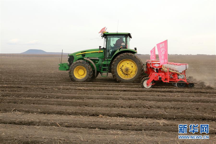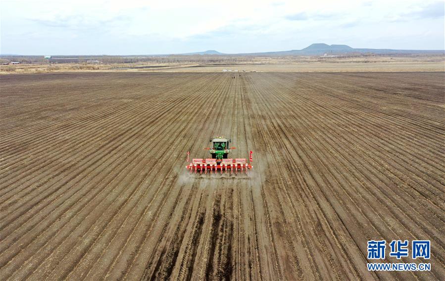 4月27日,在北大荒农垦集团总公司五大连池农场有限公司第一管理区,拖拉机进行春播作业。新华社发(陆文祥摄)