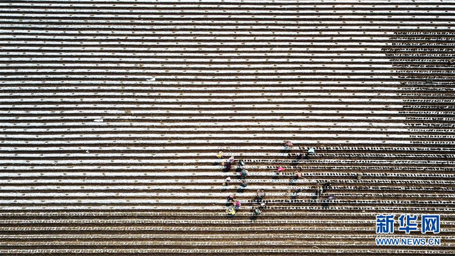 在黑龙江省兰西县兰西镇向阳村一处耕地上,种植户在移载马铃薯(4月14日无人机照片)。新华社记者王建威摄