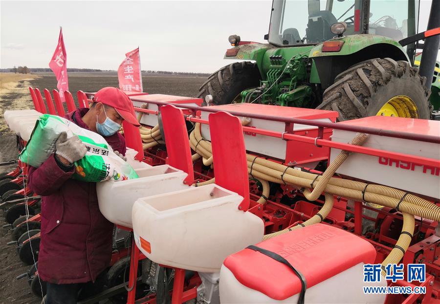 4月27日,在北大荒农垦集团总公司五大连池农场有限公司第一管理区,农场职工向播种机内补充玉米种子进行大田播种作业。新华社发(陆文祥摄)