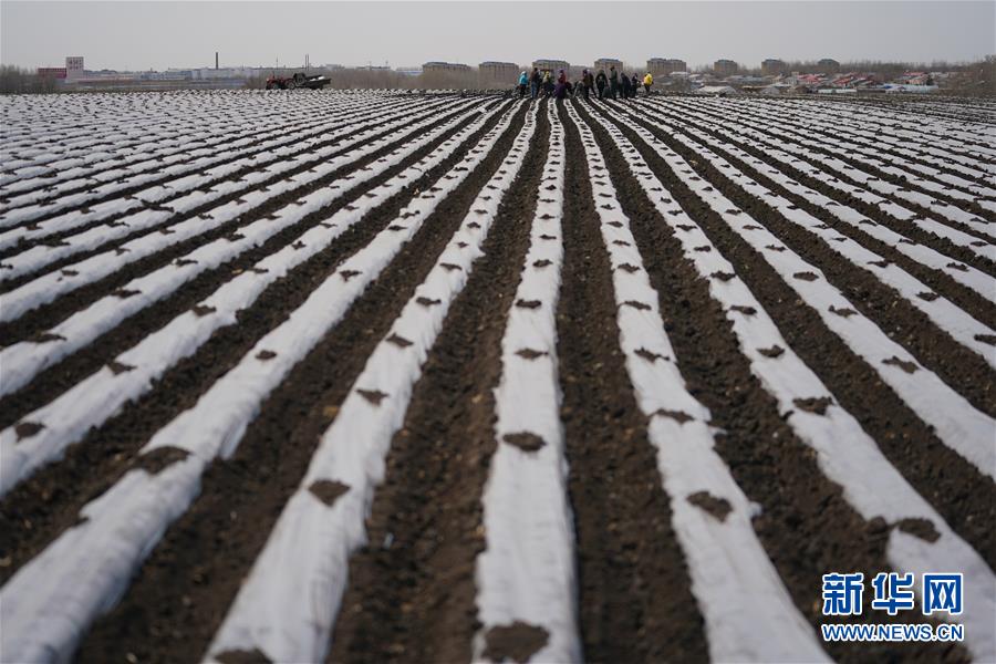 在黑龙江省兰西县兰西镇向阳村一处耕地上,种植户在移载马铃薯(4月14日摄)。新华社记者王建威摄