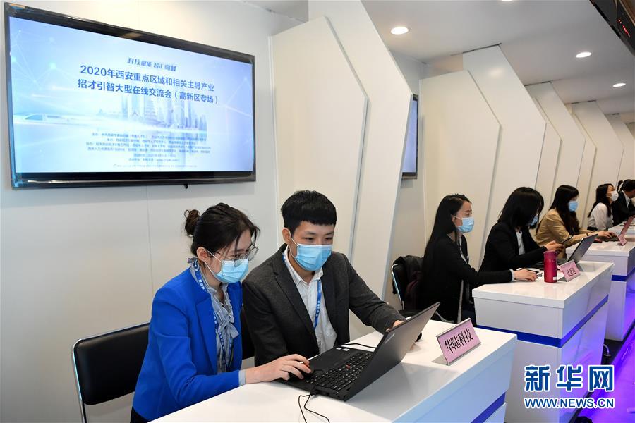 4月14日,用人单位在西安高新区丝路人才大市场集中进行网络招聘。新华社记者刘潇摄