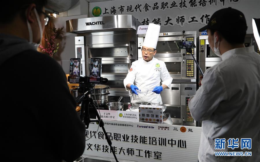 3月25日,在上海市现代食品职业技能培训中心,国家西式面点高级技师宋伟泉在网络直播课程上介绍青团面皮的制作方法。 新华社记者方喆摄