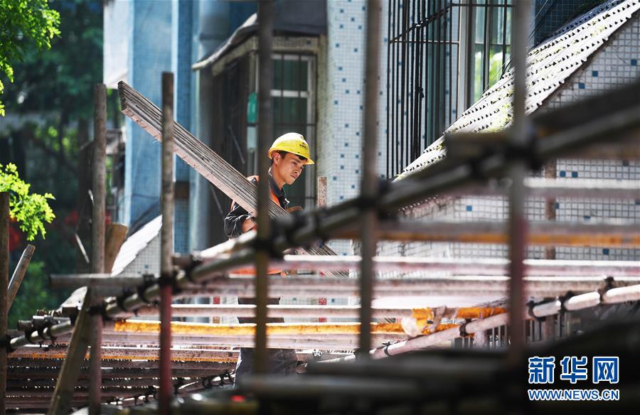 4月26日,工人在重庆市渝中区大溪沟街道双钢路社区改造提升项目施工现场作业。 新华社记者王全超摄