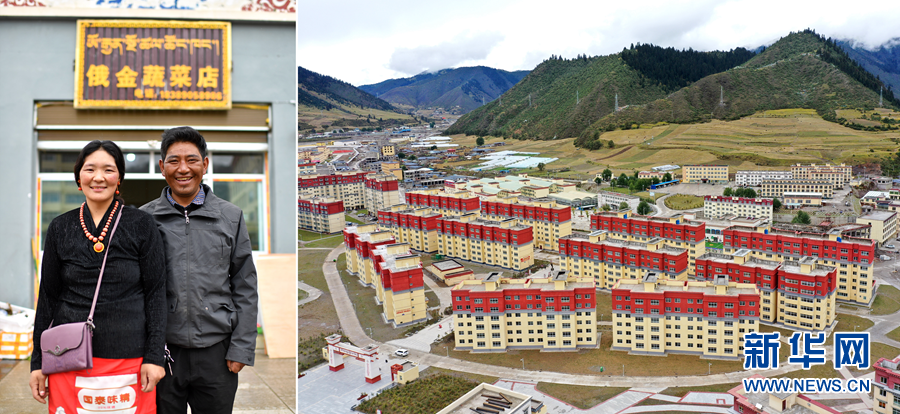 2020年9月22日拍摄的拼版照片:左图为西藏自治区昌都市类乌齐县长毛岭乡达雄村村民俄金(右)和妻子阿丁在安置点俄金蔬菜店前;右图为类乌齐县桑多扶贫开发区易地扶贫搬迁安置点一角(无人机照片)。 新华社记者 詹彦 摄