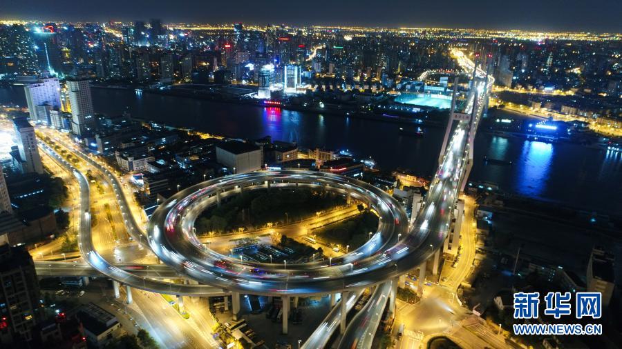 这是上海南浦大桥夜景(2017年4月13日摄,无人机照片)。新华社记者丁汀摄
