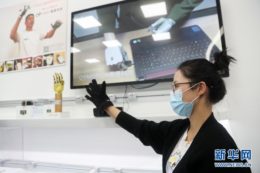 在上海张江人工智能岛内,工作人员在展示“智能神经仿生手”(11月3日摄)。新华社记者丁汀摄