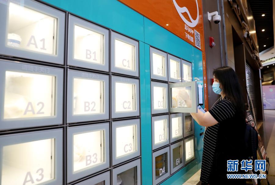 一位顾客通过APP扫码,在上海地铁13号线世博会博物馆地铁站附近的一家盒小马服务点取餐柜中拿取预定的早餐(7月17日摄)。新华社记者方喆摄