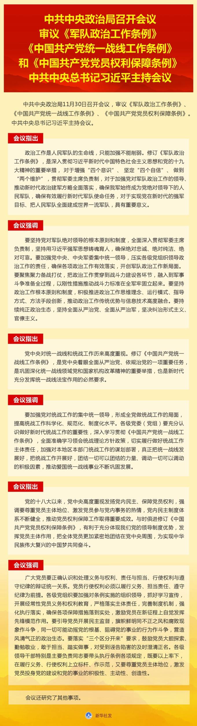 新华社北京11月30日电 中共中央政治局11月30日召开会议,审议《军队政治工作条例》《中国共产党统一战线工作条例》《中国共产党党员权利保障条例》。中共中央总书记习近平主持会议。