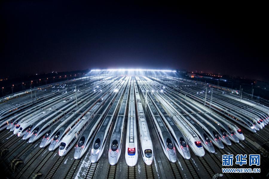 动车组停靠在武汉动车段的存车线上,准备进行检修和保温作业(2018年2月1日摄)。新华社记者肖艺九摄