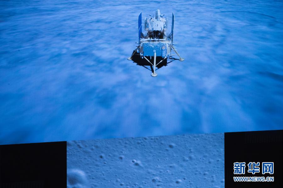 2020年12月1日23时11分,嫦娥五号探测器成功着陆在月球正面西经51.8度、北纬43.1度附近的预选着陆区,并传回着陆影像图。这是在北京航天飞行控制中心拍摄的嫦娥五号探测器落月瞬间。新华社记者金立旺摄