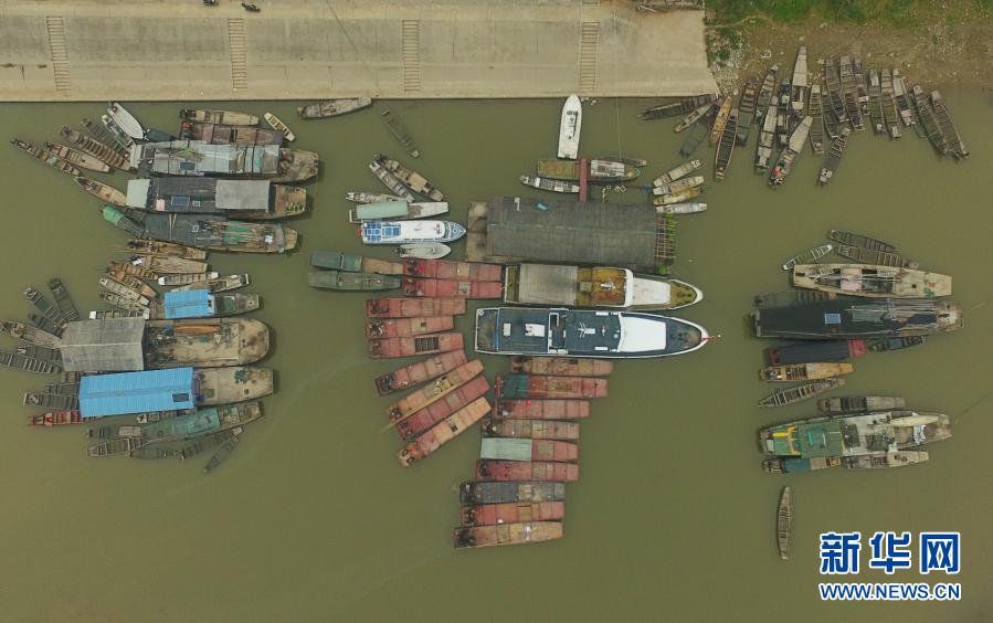 在湖南常德汉寿县蒋家嘴镇,待回收的铁渔船停靠在洞庭湖边(2019年12月17日摄,无人机照片)。2020年1月1日零时起,长江流域332个自然保护区和水产种质资源保护区全面禁止生产性捕捞。新华社记者薛宇舸摄
