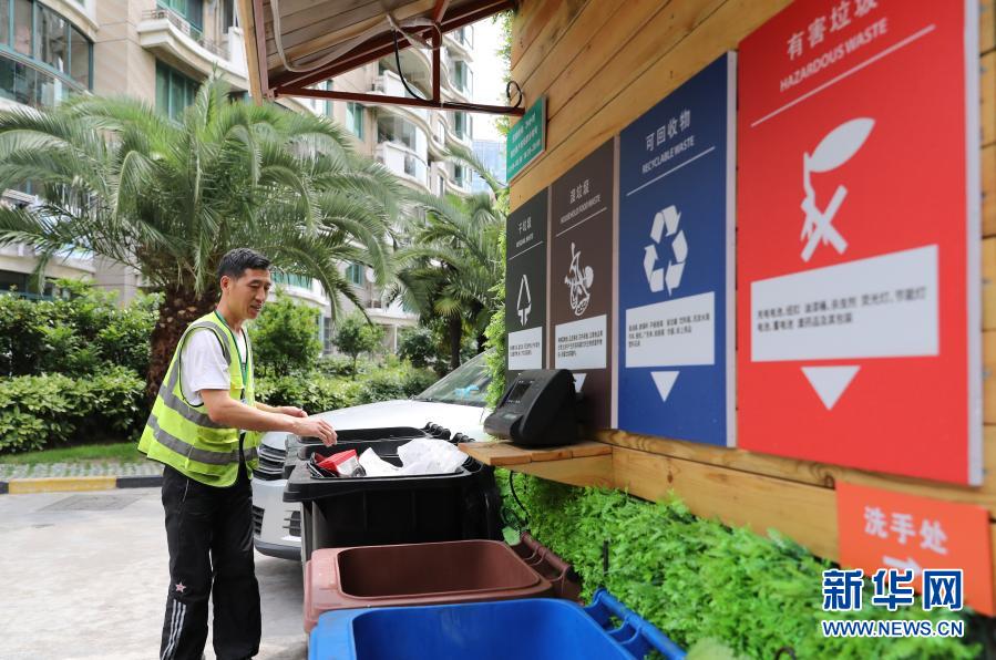 在上海市虹口区嘉兴路街道一处小区,保洁工对居民分类投放的生活垃圾进行分拣(2019年6月24日摄)。新华社记者方喆摄