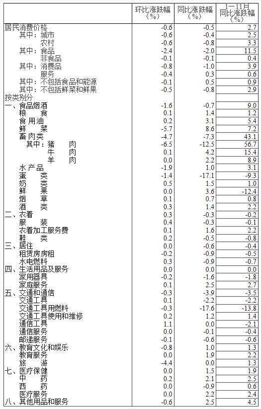 11月份,全国居民消费价格环比下降0.6%。其中,城市下降0.6%,农村下降0.6%;食品价格下降2.4%,非食品价格下降0.1%;消费品价格下降0.8%,服务价格下降0.4%。