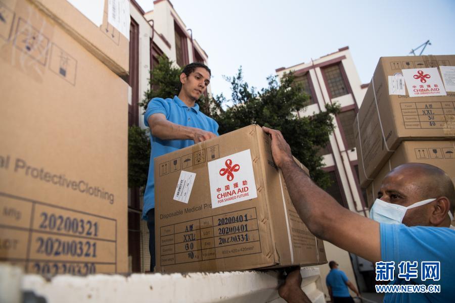 5月10日,在埃及首都开罗,工作人员搬运中国政府援助的第二批抗疫物资。新华社记者 邬惠我 摄