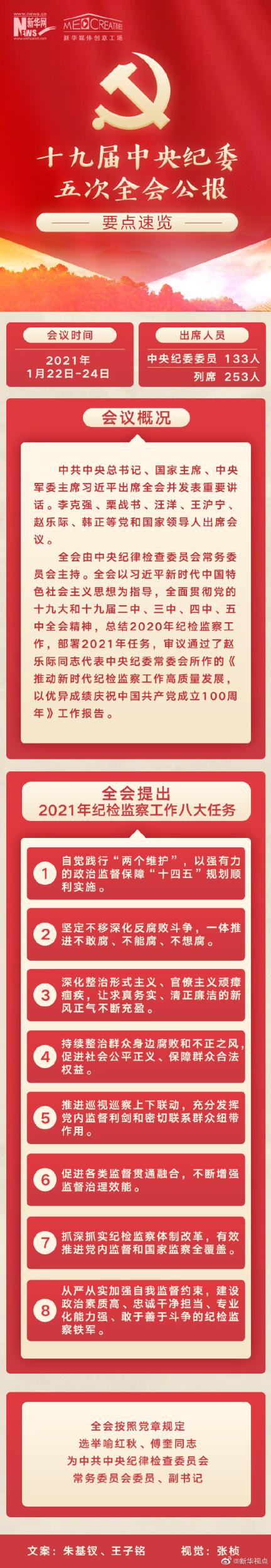 中国共产党第十九届中央纪律检查委员会第五次全体会议,于2021年1月22日至24日在北京举行。出席这次全会的有中央纪委委员133人,列席253人。