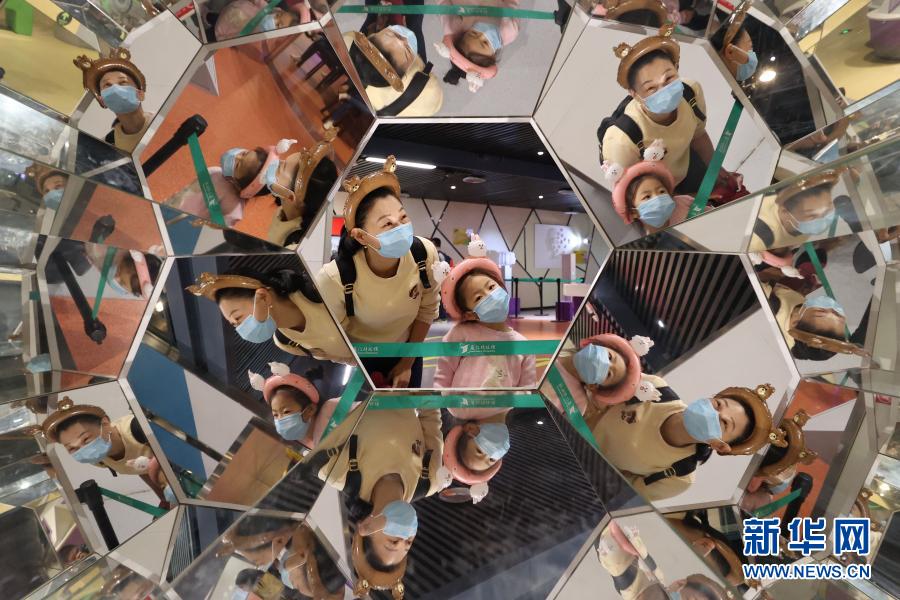 2月16日,小朋友和家长在厦门科技馆体验钝角六面体镜。新华社发(曾德猛摄)