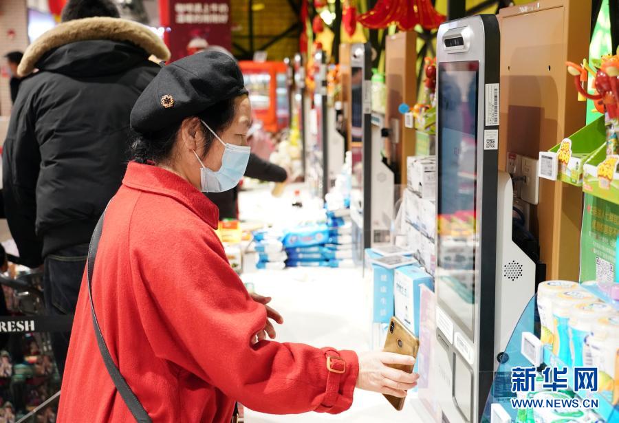2月15日,在北京市海淀区的七鲜超市北京华宇店,顾客通过自助收银机结帐。新华社记者任超摄