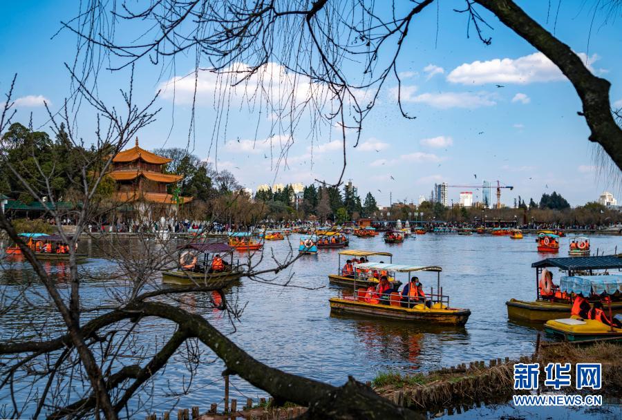 2月16日,游客在云南省昆明市大观公园里划船。新华社记者陈欣波摄