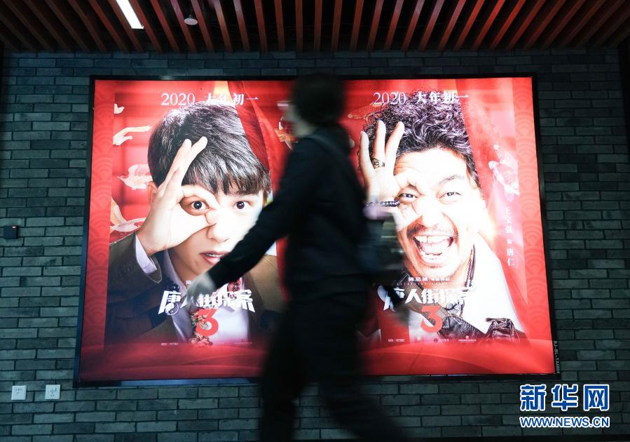 2月17日,在北京前门的保利国际影城,观众从《唐人街探案3》海报前走过。新华社记者陈钟昊摄