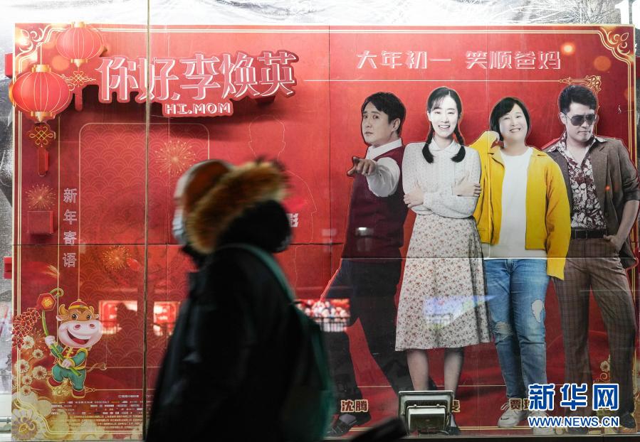 2月17日,在北京的中影国际影城外,市民从电影《你好,李焕英》海报前走过。新华社记者陈钟昊摄