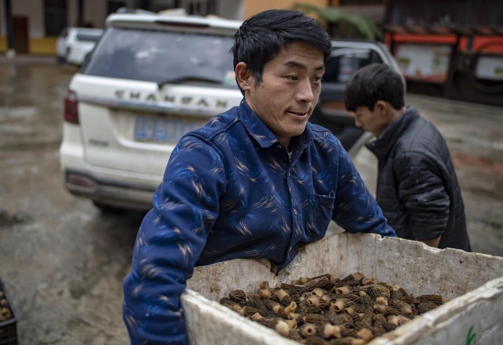 云南贡山县独龙江乡龙元村“致富能手”和晓永在乡里卖羊肚菌(2019年4月19日摄)。新华社记者江文耀摄